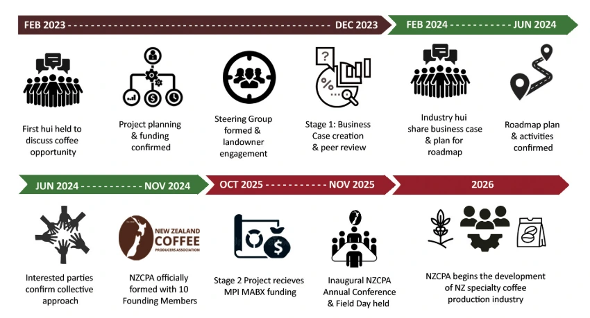 two stages of support from the Ministry of Primary Industries and formal establishment of the New Zealand Coffee Producers Association.